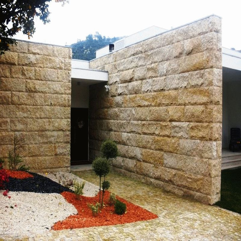 Gesägte Mauersteine aus Granit Tiago. Farbe Gelb bis hellgelb. Zaunsystem-Mauersteine mit 30 cm Steintiefe. Steinhöhen: 25 /30 / 40 cm, Steinlängen: 30 - 60 cm Einzellänge. Ausführung: Stoß- und Lagerfugen gesägt, Vorder- und Rückseite sauber gespalten und nachbearbeitet. Für beidseitig sichtbares Mauerwerk oder Zaunsysteme bis ca. 220 cm Höhe. Tiago Granit ist ein homogener, intensiv gelber, mittel- bis feinkörniger Granit aus Nordportugal. Er zeichnet sich durch ausgezeichnete technische Eigenschaften aus. Mit einer Wasseraufnahme von nur 0,2 % bleibt dieser Stein auch nach Jahren farbecht. Granit Tiago gelb ist frostbeständig, rostfrei und säurebeständig. Granit Tiago gelb bieten wir mit sandgestrahlten Oberflächen an, die gelbe Farbe des Gesteins wird dadurch freundlich hellgelb. Andere Oberflächenbehandlungen sind auf Anfrage möglich. Granit Tiago ist ein Natursteinprodukt und unterliegt sehr geringen Korn- und Farbschwankungen. Der Preis zu diesem Artikel ist gültig ab Werk Portugal bei genannter Mindestbestellmenge. Sollten Sie weniger benötigen, klicken Sie auf den blauen Botton Preisanfrage. Sie bekommen schnellstens ein kostenloses Angebot. Wir beraten Sie gerne auch telefonisch. Rufen Sie uns an +49 7761 93790460, aus der Schweiz +41 32 5132833.
