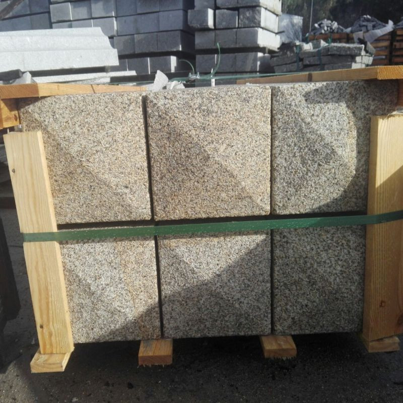 Zaunpfosten, Pergolapfosten und Zaunelementpfosten aus Granit Tiago. Farbe Gelb bis hellgelb, sehr feinkörniger Granit, mit sandgestrahlten Flächen. Querschnitt 30 x 30 cm, Ausführung mit Pyramidenspitze, Längen bis 350* cm. Individuelle Formate und Größen sind realisierbar. Tiago Granit ist ein homogener, intensiv gelber, mittel- bis feinkörniger Granit aus Nordportugal. Er zeichnet sich durch ausgezeichnete technische Eigenschaften aus. Mit einer Wasseraufnahme von nur 0,2 % bleibt dieser Stein auch nach Jahren farbecht. Granit Tiago gelb ist frostbeständig, rostfrei und säurebeständig. Granit Tiago gelb bieten wir mit sandgestrahlten Oberflächen an, die gelbe Farbe des Gesteins wird dadurch freundlich hellgelb. Andere Oberflächenbehandlungen sind auf Anfrage möglich. Granit Tiago ist ein Natursteinprodukt und unterliegt sehr geringen Korn- und Farbschwankungen. Der Preis zu diesem Artikel ist gültig ab Werk Portugal bei genannter Mindestbestellmenge. Sollten Sie weniger benötigen, klicken Sie auf den blauen Botton Preisanfrage. Sie bekommen schnellstens ein kostenloses Angebot. Wir beraten Sie gerne auch telefonisch. Rufen Sie uns an +49 7761 93790460, aus der Schweiz +41 32 5132833.