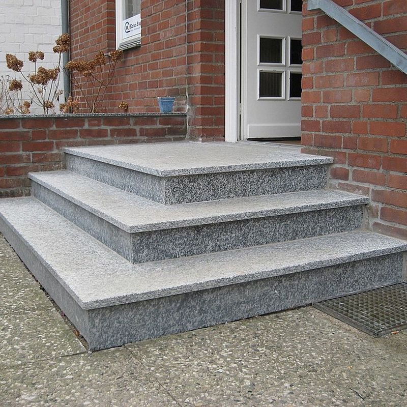 Trittstufen aus Granit Elena, 6 cm stark, 30 cm breit, Farbe weißgrau. Feinkorn, alle Flächen geflammt, mit leichter Fase. Standardlängen von 80 cm - 250 cm. Individuelle Längen, Größen und Trittstufen mit Radius auf Anfrage. Passgenaue Gehrungsschnitte auf Anfrage möglich. Granit Elena ist ein weißer, sehr heller und feinkörniger Granit aus Nordportugal. Dieser Granit eignet sich vorwiegend für massive Natursteinprodukte im Straßenbau sowie im Garten- und Landschaftsbau. Granit Elena ist frostsicher, säurebeständig und rostfrei, Granit Elena bieten wir mit geflammter Oberfläche an. Gestockte, kugel- oder sandgestrahlte Oberflächenbearbeitungen sind möglich, bei Bedarf bitte anfragen. Granit Elena kann im Innenbereich mit polierter Oberfläche bedenkenlos verwendet werden. Granit Elena ist ein Natursteinprodukt und unterliegt natürlichen Farb- und Kornschwankungen. Der Preis zu diesem Artikel ist gültig ab Werk Portugal bei genannter Mindestbestellmenge. Sollten Sie weniger benötigen, klicken Sie auf den blauen Botton Preisanfrage. Sie bekommen schnellstens ein kostenloses Angebot. Wir beraten Sie gerne auch telefonisch. Rufen Sie uns an +49 7761 93790460, aus der Schweiz +41 32 5132833.